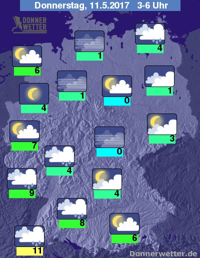 In der Nacht zum Donnerstag fällt im äußeren Nordosten unter dichten Wolken gebietsweise Regen, im Südwesten fällt bei bedecktem Himmel zeitweise Regen, der sich im Nachtverlauf weiter nach Nordosten hin ausbreitet. Sonst ist der Himmel über dem Land verbreitet sternenklar und es dazu ist es trocken. Die Temperatur sinkt auf milde 11 Grad in Freiburg und bis auf den Gefrierpunkt im Eichsfeld.