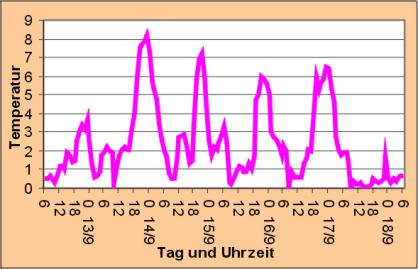 Dabei zeigten sich Temperaturdifferenzen von 8 Grad auf 500 m Entfernung. Während es abends im Umfeld des Marktes rasch abkühlte und nur 12-13 Grad gemessen wurden, blieb es auf dem Jahrmarktgelände mit 20 Grad noch angenehm warm.