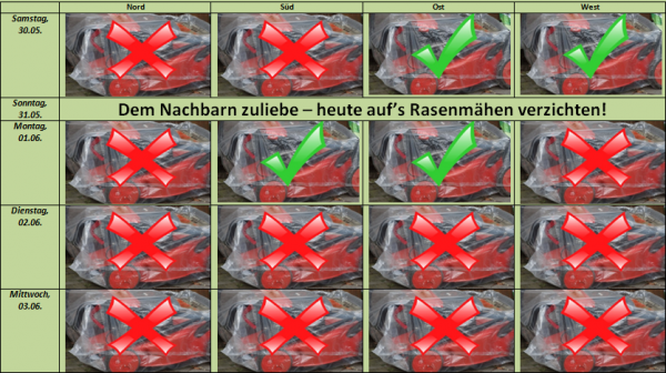 Ausgerechnet am schönsten Tag der Woche, dem morgigen Sonntag, sind laute Mäh- oder Häckselarbeiten - des lieben Friedens willen - nicht möglich.