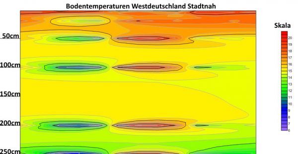 Jetzt wird es kühl draußen! Über das Wochenende liegen die Bodentemperaturen in einer Tiefe zwischen 2 cm und 30 cm noch verbreitet bei Werten um 8 bis 10 Grad C. Erst ab 40 cm Bodentiefe werden Temperaturen von über 12 Grad C erreicht. Zum Pflanzen von Bäumen sind das optimale Bedingungen, denn zwischen 40 und 100 cm Tiefe ist es noch warm genug, damit Pflanzen anwurzeln können.