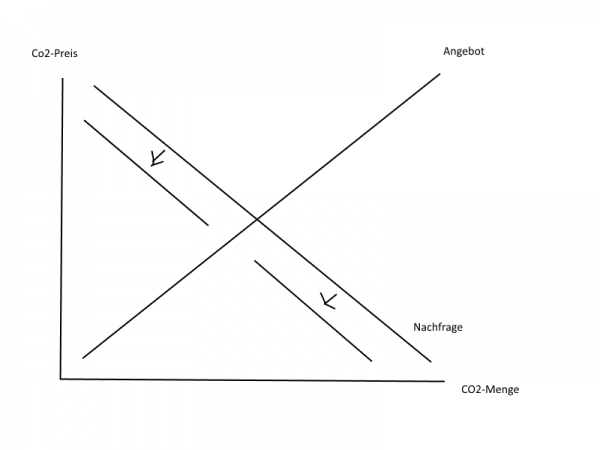Die folgende Abbildung zeigt Angebot/Nachfrage und die Veränderung eines deutschen Ausstieges im Co2-Markt weltweit. Der Co2-Preis sinkt.