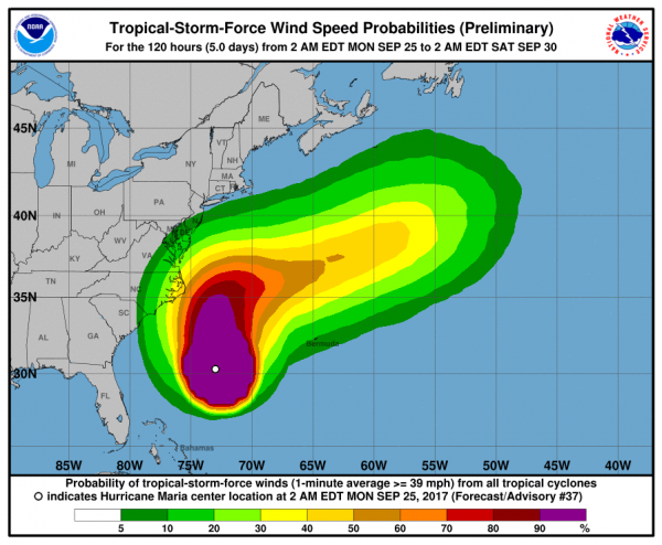 Laut den aktuellen Prognosen des National Hurricane Centers (NHC), wird am Mittwoch die Küste North Carolinas betroffen sein. Die Inselgruppe Outer Banks wird mit einer Wahrscheinlichkeit von 50-60% mit tropensturmcharakteristischen Winden zu kämpfen haben.