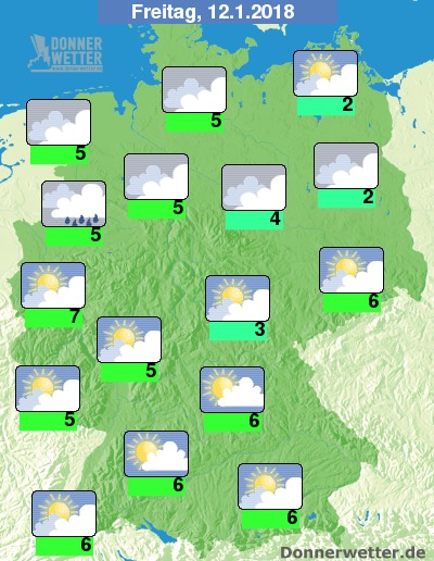 Am Donnerstag (11.01.) zog von Polen ein Regengebiet über den Nordosten und Schleswig-Holstein hinweg und erreichte gegen Abend die Nordsee und Emsmündung. Stellenweise fiel bei Temperaturen im Bereich des Gefrierpunktes sogar gefrierender Regen. Sonst gab es in Deutschland Wolken, Nebel und gebietsweise etwas Sonne bei meist milden 3 bis 10 Grad C, um Stuttgart herum auch bis 12 Grad C.