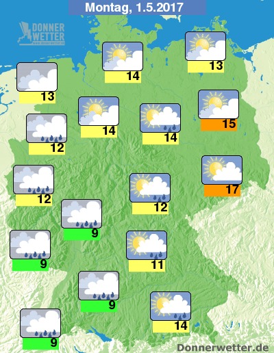 In der Südwesthälfte regnete es am Maifeiertag bei 8 bis 12 Grad C gelegentlich. Wegen der seit Ende März andauernden Trockenheit war dies jedoch für einige Regionen nur der berühmte Tropfen auf den heißen Stein. Im Nordosten blieb es trocken und die Sonne konnte sich für längere Zeit behaupten. Hier stiegen die Temperaturen immerhin auf 12 bis 18 Grad C.