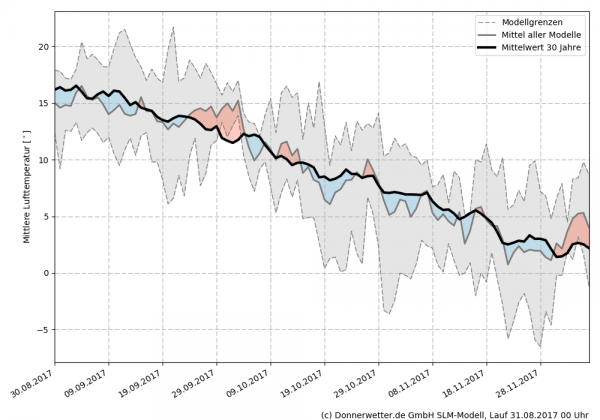 Weiterhin erlauben sich die laut unserer aktuellen Modelle zu erwartenden Temperaturen und Niederschlagssummen in den nächsten Wochen nur selten größere Ausreißer. Zumindest die zur Zeit berechneten Sonnenstunden lassen den Osten auf ein "bisschen goldenen Herbst" hoffen, sie liegen bis Mitte Oktober häufig über dem langjährigen Mittel.