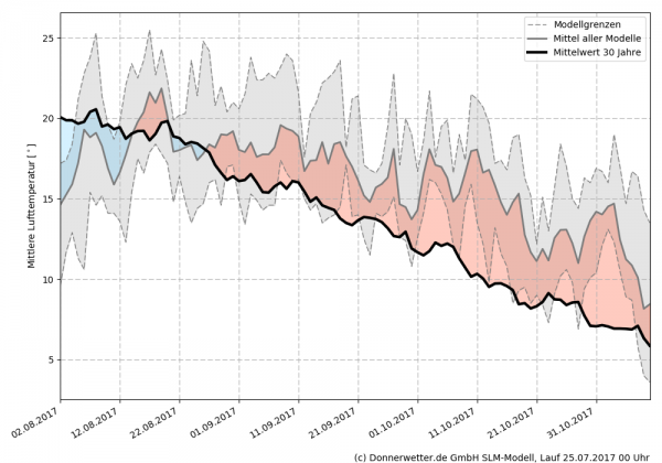 So berechnet unser Langfristmodell aktuell nicht nur die mittlere Lufttemperatur mit überdurchschnittlichen Werten, auch die Sonnenscheindauer könnte uns für die Wettereskapaden im Juli entschädigen. Mit vielen schönen Spätsommerphasen ist vor allem ab Mitte / Ende August zu rechnen.