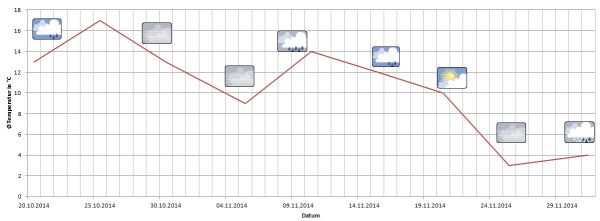 Wechselhaftes Wetter wird aber weitgehend bestimmend sein. Zum Monatswechsel November / Dezember kommen die Temperaturen mit einstelligen Werten dem Winter aber bereits ein Stückchen näher.