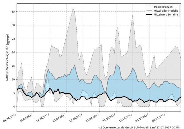 Dem Süden stehen wechselhafte Wochen bevor. Bis Anfang November, so weit berechnet unser Prognosemodell zur Zeit, kündigen sich viele feuchte Tage an. Dennoch macht sich zwischendurch auch immer wieder die Sonne bemerkbar und die mittleren Lufttemperaturen liegen vor allem ab Mitte September zum Teil deutlich über den langjährigen Mittelwerten.
