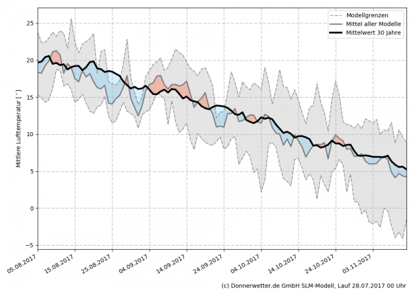 So viele strahlend sonnige und warme Spätsommer- und Frühherbsttage wie in den letzten Wochen sehen die Langfristprognose-Modelle aktuell nicht mehr. Die meisten Tage mit überdurchschnittlich vielen Sonnenstunden bleiben dem September erhalten, der Oktober wirkt, auch in Hinblick auf die berechneten Lufttemperaturen und Niederschlagsmengen, nun als überwiegend durchschnittlicher Monat.