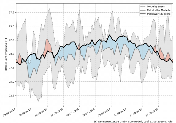 Während die Prognosen der zu erwartenden Niederschlagssummen für die nächsten Wochen im Westen keinem eindeutigen Trend folgen, berechnen die Modelle bei den Temperaturen für diese Jahreszeit zu niedrige Werte. Die Sonne zeigt sich über weite Strecken seltener als üblich.