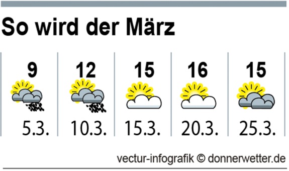Unsere Prognose für den März 2015 im Vergleich zum langjährigen Mittel: Etwa 1 Grad C zu warm, leicht zu trocken, leicht zu sonnig.