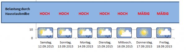 In den kommenden Tagen liegen die Hausstaubwerte auf einem hohen Niveau; erst mit Wetterbesserung zur Mitte der nächsten Woche sinken die Belastungen wieder ein wenig.