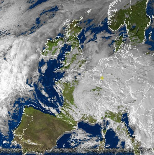 Auf dem Satellitenfoto von heute Nachmittag erkennen wir über weiten Teilen von Mittel- bis nach Ost- und Südosteuropa eine geschlossene Wolkendecke. Unter den Wolken herrscht verbreitet nasskaltes Wetter mit vielerorts langanhaltendem Regen. Unter Hochdruckeinfluss meist trocken und teils auch freundlich ist es hingegen von den Britischen Inseln bis nach Skandinavien hinein.