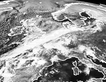 Die Kaltfront des Tiefs 'Christoph' über Skandinavien ist auf dem Satellitenbild vom Montagmittag an einem langen Wolkenband zu erkennen, das sich von der Ostsee über Norddeutschland, die Niederlande und Nordfrankreich bis auf den Atlantik erstreckt. Auf seiner Vorderseite ist es teils noch aufgelockert, teils haben sich dichtere Wolken gebildet. Auf seiner Rückseite folgt von Norden Kaltluft, man erkennt rund um die Britischen Inseln verbreitet lockere Schauerbewölkung. Die Front hat sich am Montag kaum verlagert, am Dienstag zieht sie aber über Deutschland nach Südosten ab. (Bildquelle: NERC Satellite Receiving Station, Dundee University, Scotland, http://www.sat.dundee.ac.uk/)