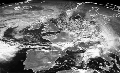 Am Dienstag Mittag ziehen von der Nordsee viele Schauer, die im Bild am Fleckenmuster gut auszumachen sind, nach Mitteleuropa bis zu den Alpen. im Osten befindet sich noch die Okklusionsbewölkung von Tief 'Stefan' über Skandinavien. Nördlich der Britischen Inseln sind die Wolken ebenfalls dichter. Hier macht sich der Ex-Hurrikan 'Noel' in einer südöstlichen Zugbahn auf dem Weg nach Mitteleuropa und bringt hier am Mittwoch Regen und Sturm mit. (Bildquelle: NERC Satellite Receiving Station, Dundee University, Scotland, http://www.sat.dundee.ac.uk/)