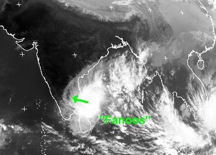Über dem Golf von Bengalen liegt der tropische Sturm 'Fanoos'. Berechnungen zufolge soll er heute mit Windgeschwindigkeiten von etwa 110, in Böen bis 140 km/h die Ostküste Indiens südlich von Madras erreichen und sich dann langsam abschwächen.