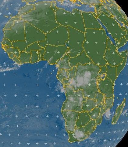 Auf dem Satellitenfoto Afrikas von heute Mittag zeigt sich der Norden des Kontinent durch verbreiteten Hochdruckeinfluss vielfach wolkenfrei und bis auf einzelne Schauer oder etwas Regen im äußersten Nordwesten auch trocken. Dagegen ist das südliche Afrika häufig von hochreichener Bewölkung überzogen, die vielerorts für teils kräftigen und ausgiebigen Regen sorgt.