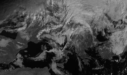 Während der Norden von Europa unter Einfluss von Tief 'Dieter' stark bewölkt ist, sorgt Hoch 'Agnes' mit Zentrum über der Iberischen Halbinsel für viel Sonne. Deutlich erkennbar ist, das die Alpen und die Pyrenäen noch verschneit sind.