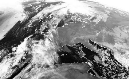 Das Satellitenbild zeigt ein Hochdruckgebiet über Mitteleuropa, das verbreitet freundliches Winterwetter bringt. Nordöstlich von Island liegt ein Tief, dessen Warmfrontbewölkung Norwegen und weite Teile Schwedens überdeckt. Vor Portugal und im östlichen Mittelmeer liegen zwei Tiefs, die beide durch Ursprung den Vorstoß kalter Luft nach Süden entstanden sind.