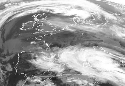 Von den Britischen Inseln bis nach Südosteuropa reicht eine Hochdruckbrücke, die die Tiefs mit ihren Regenwolken weit im Norden vorbeiführt. Regen fällt zum Beispiel in Norwegen. Die Wolken, die über Norddeutschland nach Süden ziehen, sind nur lockere hohe Wolken, die keinen Niederschlag bringen. Über dem westlichen Mittelmeer liegt dagegen ein Tief mit ausgedehntem Wolkengebiet. Hier kommt es teils zu kräftigen Regenfällen und auch zu Sturm.