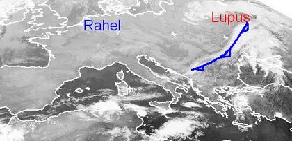 In weiten Teilen West- und Mitteleuropas sorgt Hoch „Rahel“ für wolkenarmen Himmel, gebietsweise halten sich jedoch hochnebelartige Wolkenfelder, auch am Sonntag bleibt das Hoch wetterbestimmend bei uns mit trockener und warmer Luft. Über dem Mittelmeerraum entwickeln sich unter Tiefdruckeinfluss zum Teil kräftige Gewitter. Auch über Südost- und Osteuropa gibt es mehrere Regenwolken, sie gehören dem Tief „Lupus“ mit Zentrum über Russland. Auf dem Satellitenbild ist sehr gut die Kaltfront des Tiefs zu erkennen, die von seinem Zentrum bis zum Balkan erstreckt. (Bildquelle: NERC Satellite Receiving Station, Dundee University, Scotland, http://www.sat.dundee.ac.uk/)