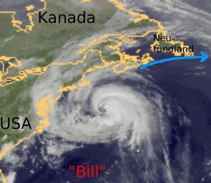 Die Ausläufer des Hurrikans 'Bill' haben heute die Ostküste der USA erreicht. Während der Wind im äußeren Bereich nicht seine größte Stärke hat, werden im Zentrum des Wirbelsturms, der weiter draußen auf dem Atlantik liegt, Windgeschwindigkeiten von etwa 140 km/h erreicht. Im Küstenbereich fällt jedoch teils sehr starker Regen. 'Bill' verlagert sich nun nach Nordosten weiter, dabei wird er voraussichtlich über Neuschottland und Neufundland hinweg ziehen.