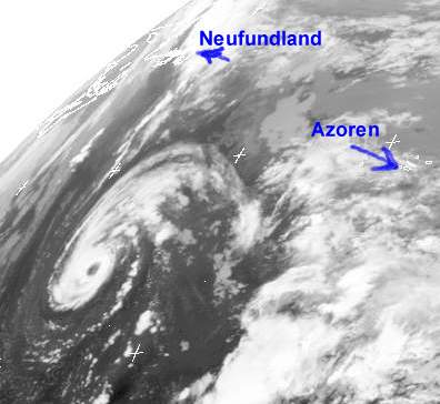 Mitten auf dem Atlantik, weit entfernt von jeder Küste, liegt der Hurrikan 'Epsilon' mit Windgeschwindigkeiten von 120 km/h und Böen bis 150 km/h. Er zieht langsam ostwärts und wird sich dabei abschwächen.
