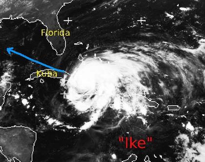 Hurrikan 'Ike' hat mit seinen Wolken heute Mittag den Osten von Kuba und im Süden Jamaika erreicht. Derzeit betragen seine Windgeschwindigkeiten 160 km/h, er hat sich also auf einen Kategorie-2-Hurrikan abgeschwächt. Trotzdem drohen schwere Schäden und durch sehr heftigen Regen auch Überschwemmungen. 'Ike' zieht nun in den Golf von Mexiko weiter und könnte über dem Meer wieder an Kraft gewinnen. (Bildquelle: Copyrigt EUMETSAT, NERC Satellite Receiving Station, University of Dundee)
