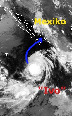 Vor zwei Tagen hat sich im östlichen Pazifik der Hurrikan 'Ivo' gebildet. Seine mittlere Windgeschwindigkeit liegt bei 120 km/h und in Böen bei 150 km/h. Nach der Saffir-Simpson-Skala hat er damit die Kategorie 1 erreicht. Seine berechnete Zugbahn wird nun auf Niederkalifornien und Mexiko zulaufen. Dabei soll er zunächst seine Stärke beibehalten. (Bildquelle: NERC Satellite Receiving Station, Dundee University, Scotland, http://www.sat.dundee.ac.uk/)