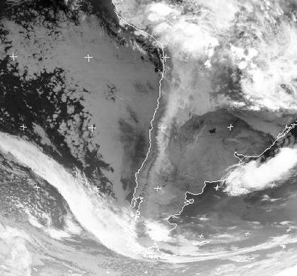 Über Argentinien und Chile erkennt man kaum Bewölkung. Schauer und Gewitter entwickeln sich nur weiter im Norden. Es erstreckt sich jedoch das Wolkenband eines Tiefausläufers vom Südpolarmeer in den Pazifik. Er zieht langsam in den Süden Chiles und bringt dort zunehmend Regen.