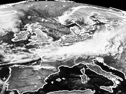 Über Skandinavien liegt das Tief 'Vere'. Seine ausgedehnte Kaltfront erstreckt sich auf dem Satellitenbild vom Montagmittag mit ihren dichten Wolken vom Baltikum über Süddeutschland bis in die Biskaya. Auf ihrer Rückseite strömt von Norden über die Nordsee kalte Luft nach Deutschland. Man erkennt dabei das aufgelockerte Muster der Schauerwolken. (Bildquelle: NERC Satellite Receiving Station, Dundee University, Scotland, http://www.sat.dundee.ac.uk/)