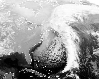 Auf dem Satellitenbild erkennt man das Wolkenband eines Tiefs mit Zentrum bei Neuengland. Es bringt auf seiner Vorderseite Regenfälle nach Neufundland und die kanadische Ostküste. Auf der Rückseite fließt sehr kalte Luft nach Süden. In der kalten Luft entstehen über dem Atlantik in einiger Entfernung zur Küste Schauerwolken. Über den östlichen USA ist es dagegen nur gering bewölkt.