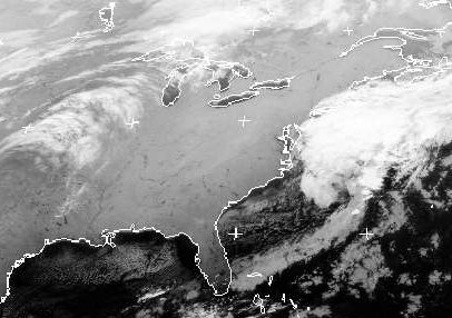 Ein Tief ist mit seinen Wolken vom östlichen Nordamerika auf den Atlantik hinaus gezogen. Auf seiner Rückseite bestimmt über dem Osten der USA ein Hochdruckgebiet das Wetter, Wolken findet man dort keine. Ein Tiefausläufer nähert sich im Westen, er bringt aber nur in Kanada, nördlich der Großen Seen Regen, im Westen der USA bringt er nur einige höhere Wolken.