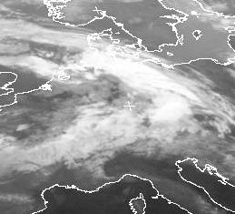 Der Ausschnitt zeigt die Okklusionfront des Tiefs 'Yoda' über dem Atlantik, sie liegt über Nordostdeutschland und Tschechien und sorgt für teils kräftige Niederschläge, südwestlich davon sind Schauerwolken zu erkennen, die sich auf der Rückseite der Regenfront in feuchter Luft entwickelt haben.