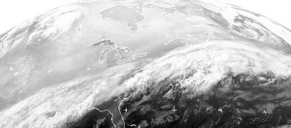 Derzeit erstreckt sich die Frontalzone, die Grenze von warmer zu kalter Luft, etwa vom Westen der USA bis nach Irland. Im Satellitenbild ist schön die langgestreckte Wolkenschleppe zu erkennen.