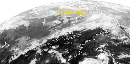Am Mittwoch Mittag (Ortszeit) erstreckt sich auf dem Satellitenbild östlich des Hudson Bay in Kanada über die Großen Seen bis nach Nordamerika hinein ein Wolkenband. Es markiert eine Luftmassengrenze, die warme Luft südöstlich von kühler Luft nordwestlich davon trennt. Im Nordwesten erscheinen die Landmassen heller als vor der Front, dieses ist ein Zeichen für die kühle Luft, die im Infrarotbereich der Satellitenaufnahme heller dargestellt wird. Im Frontbereich kommt es zu Niederschlägen, südöstlich davon haben sich einzelne Gewitterzellen gebildet. (Bildquelle: NERC Satellite Receiving Station, Dundee University, Scotland, http://www.sat.dundee.ac.uk/)