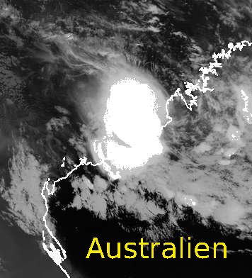 Ein schön ausgebildete Gewitterzelle offenbart das Satellitenbild von heute Mittag über dem Nordwesten Australiens. An der sehr weißen Färbung des Wolkenbereiches zeigt sich, dass es sich um sehr hohe Eiswolken handelt, da kältere Temperaturen bei der Infrarotaufnahme des Satelliten heller dargestellt werden. Dagegen sind die Wolken rings um die Zelle herum nicht so weiß, da sie auch nicht so hoch sind. Im Bereich des Gewitterschirmes treten lokal heftige Niederschläge auf, teils kann es auch sehr windig sein. (Bildquelle: Copyrigt EUMETSAT, NERC Satellite Receiving Station, University of Dundee)
