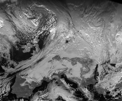 Auf dem heutigen Satellitenfoto sind über dem nördlichen Europa verbreitet dichte Wolken zu erkennen, diese sorgen meist für gelegentliche Niederschläge, die übewiegend als Schnee fallen. Auch im zentralen Mittelmeer sorgt ein kräftiges Tief für dichte Wolken und teils kräftigen Regen. Von West- bis ins östliche Mitteleuropa herrscht dagegen Hochdruckeinfluss mit überwiegend trockenem und teils freundlichem Wetter, vielfach hält sich aber auch zäher Hochnebel.