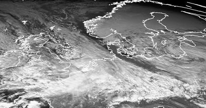 Über Mitteleuropa sind am Dienstag Mittag kaum Wolkenlücken vorhanden. Im Osten sorgt Tief 'Valter' für dichte Wolken am Himmel, über Großbritannien, Frankreich und Deutschland bringt Islandtief 'Wolf' die Wolkenfelder. Über Skandinavien haben sich unter Hochdruckeinfluss verbreitet Hochnebelfelder gebildet. Mit der nordwestlichen Strömung hat sich von westlichen Norwegen beginnend in südöstlicher Richtung ein wolkenloser Streifen etabliert, der bis nach Polen reicht und durch die Strömung am Skandinavischen Gebirge vorbei ausgelöst wurde. (Bildquelle: NERC Satellite Receiving Station, Dundee University, Scotland, http://www.sat.dundee.ac.uk/)