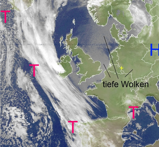 Auch über der Nordsee dominierten tiefhängende Wolken. Erste Ausläufer Atlantischer Tiefdruckgebiete nähern sich dem Europäischen Kontinent.