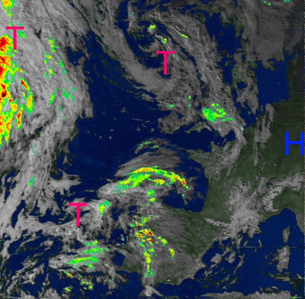 Morgen erreichen uns die Wolken bei den Britischen-Inseln und westlich von Frankreich. Sie gehören zu Atlantischen Tiefdruckgebieten, die sich jedoch Richtung Kontinent abschwächen und bei uns vermutlich nur für etwas Regen oder einige Schauer sorgen werden.