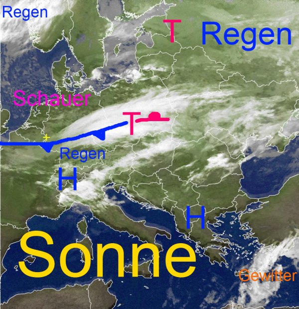 Über dem östlichen Bereich sorgt ein kleines Tief immer noch für Schauer- und Gewitterwolken.