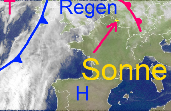 Im Bereich des Frontensystems fällt aus dichten grauen Schichtwolken Regen und Sprühregen. Hinter der Warmfront strömt von Südwesten deutliche mildere Luft nach Mitteleuropa. Bei einem zeitweise spürbaren Süd- bis Südwestwind kann in den nächsten beiden Tagen die Luftmasse über Deutschland abtrocknen, wobei sich die Wolken teilweise auflösen und der Sonne Platz machen. Dann können die Temperturen auf über 15 Grad klettern.