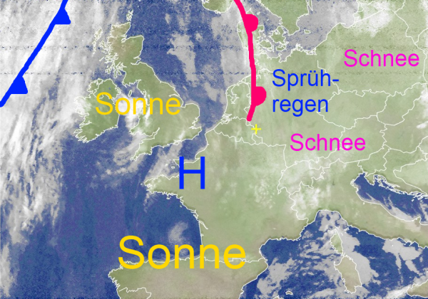 An der von Skandinavien hereinziehenden Warmfront fällt gelegentlich leichter Regen und Sprühregen. Über Süddeutschland bleibt es zunächst noch gebietsweise bei leichtem Schneefall. Die Temperaturen werden in den nächsten beiden Tagen in Deutschland jedoch ansteigen.
