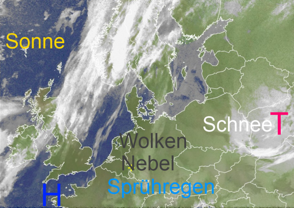 Mildere Nordseeluft gleitet über die bodennahe Kaltluftschicht und sorgt in weiten Teilen Mitteleuropas für tiefhängende graue Wolken oder auch Nebel. Daraus fällt immer wieder Regen und Sprühregen, über dem kalten Osteuropa, sowie Bayern zunächst auch noch etwas Schnee. Morgen wird es aber auch hier etwas milder, so dass aus den Flocken zumindest in tieferen Lagen immer mehr Tropfen werden.