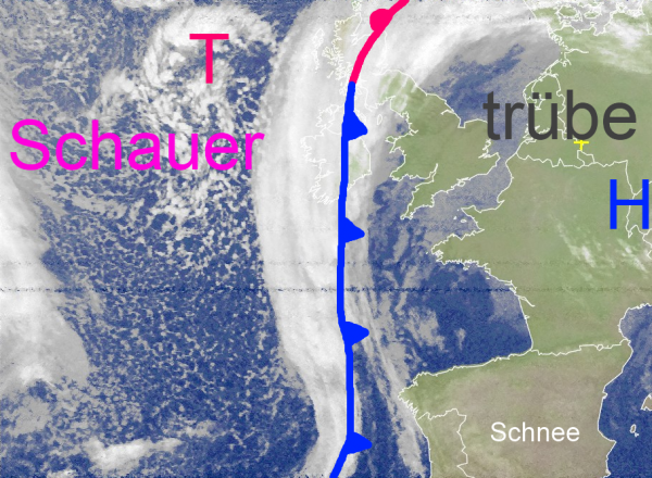 Morgen erreicht uns jedoch vom Atlantik eine Regenfront, die zumindest einen kurzen Luftmassenwechsel ankündigt. Die wabenförmige Schauerbewölkung zeigt die hinter der Front von Norden heranströmende kältere Polarluft. Diese sorgt von Mittwoch auf Donnerstag für ein winterliches Intermezzo in Deutschland.