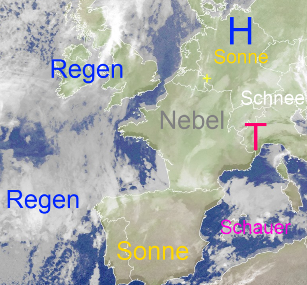 Über Westeuropa formen sich neue Störungen, die mit ihren Niederschlagsgebieten nach Mitteleuropa steuern und ab morgen Nachmittag bereits im Westen wieder für Schnee oder Schneeregen sorgen können.