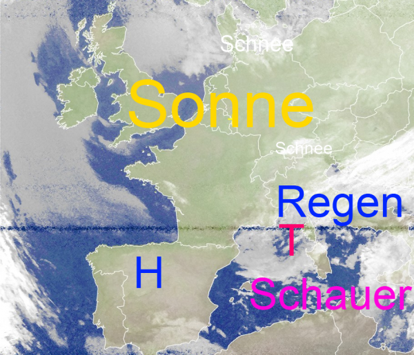 Das hartnäckige Tief über dem Mittelmeer sorgt in Südeuropa für Regen- und Schauerwolken.