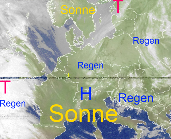 Das Hoch über den Alpen sorgt in Deutschland für eine kurze Wetterberuhigung. Die Regenwolken verziehen sich nach Osten und die Wolkendecke lockert auf. Hauptsächlich im Südwesten unseres Landes schien die Sonne heute schon für längere Zeit. Während sich morgen auch im Osten unseres Landes das Wetter bessert, ziehen im Südwesten neue Regenwolken des Tiefs bei Irland auf.