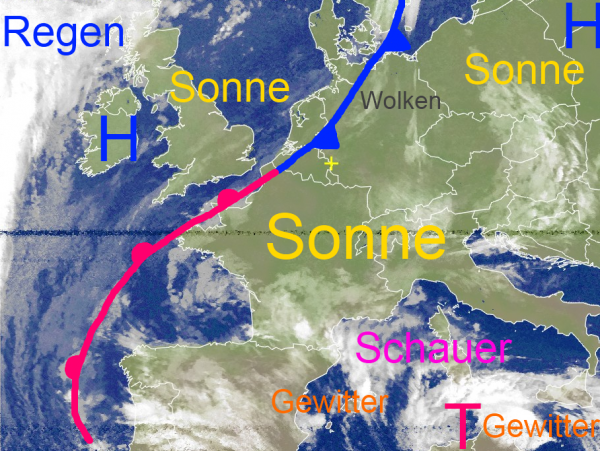 Die über Norddeutschland angelangte schwache Kaltfront sorgt gebietsweise für dichtere Wolken und stellenweise auch etwas Regen. Dadurch werden die Temperaturen nach unten gedrückt. Hinter der Front breitet sich von Irland und Großbritannien ein neues Hoch nach Mitteleuropa aus. Daher wird es bis mindestens Sonntag auch trocken weitergehen. Allerdings steigt die Nebel- und Hochnebelneigung in der kühleren Luft an.